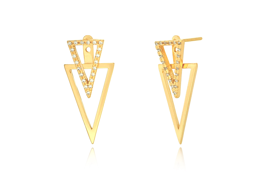 BRINCO EM PRATA, 2 TRIÂNGULOS VAZADOS E 1 ZIRCÔNIA, 11,50mm ALTURA