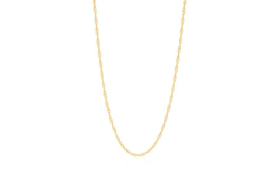 CORRENTE BANHADA EM OURO, ELO CORDA 3mm, 45cm COMPRIMENTO, EXTENSOR 5cm COMPRIMENTO E PESO 12,20g