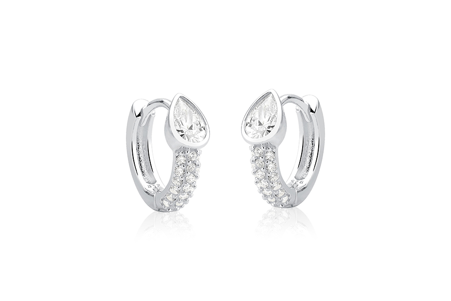 BRINCO EM PRATA, ZIRCÔNIA GOTA COM BORDAS CRAVEJADAS, 10mm ALTURA, GALERIA EM FILIGRANA