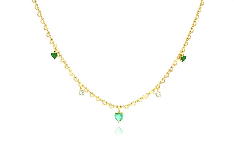 GARGANTILHA BANHADA EM OURO, CRISTAL CORAÇÃO 15mm LARGURA E CORRENTE ELO 4mm LARGURA, 40cm COMPRIMENTO