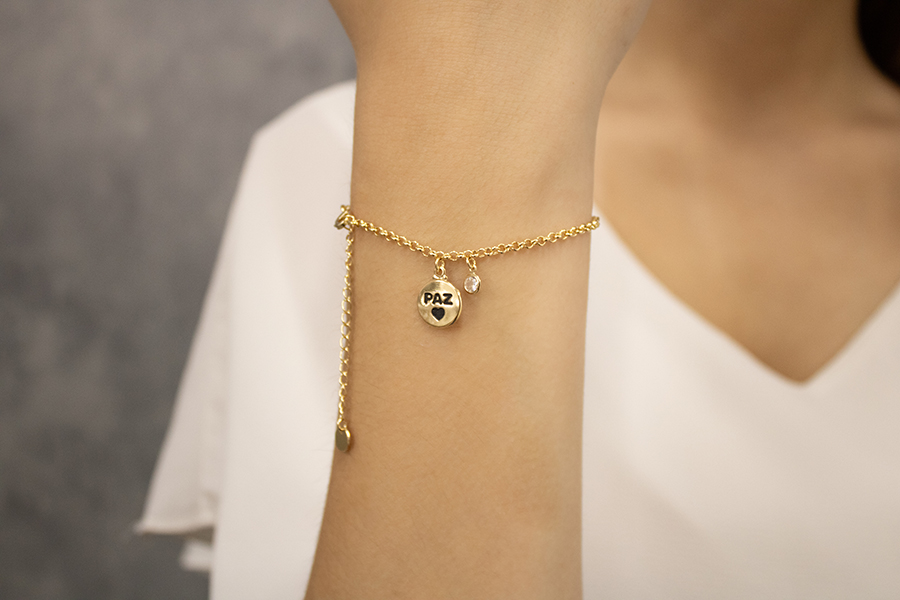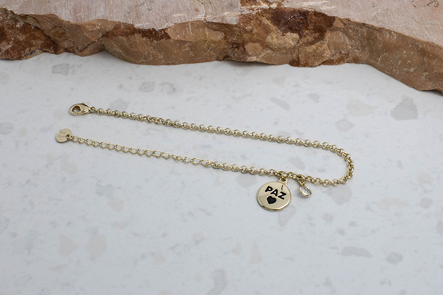 PULSEIRA BANHADA EM OURO, ELO PORTUGUÊS 2,50mm, 16cm COMPRIMENTO, PONTO DE LUZ 4,50mm E PINGENTE PAZ 11mm DIÂMETRO