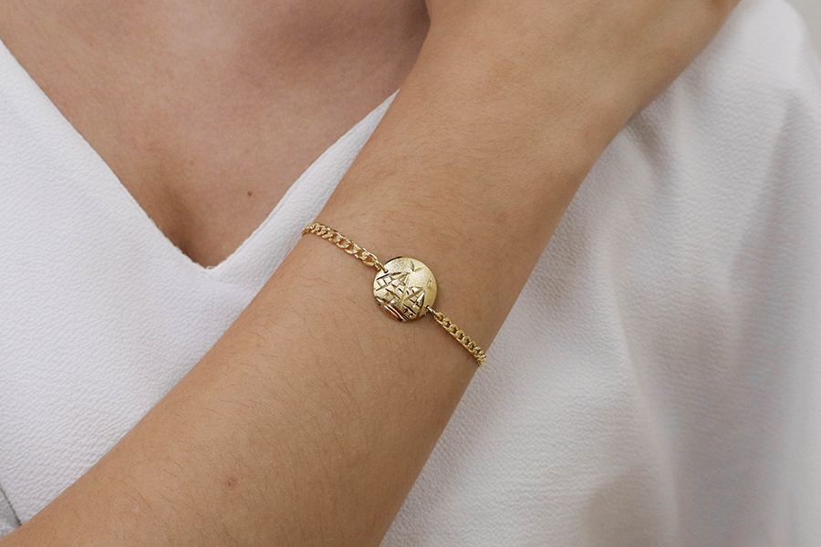 PULSEIRA BANHADA EM OURO, ELO PORTUGUÊS 2,50mm, 16cm COMPRIMENTO, PONTO DE LUZ 4,50mm E PINGENTE PAZ 11mm DIÂMETRO