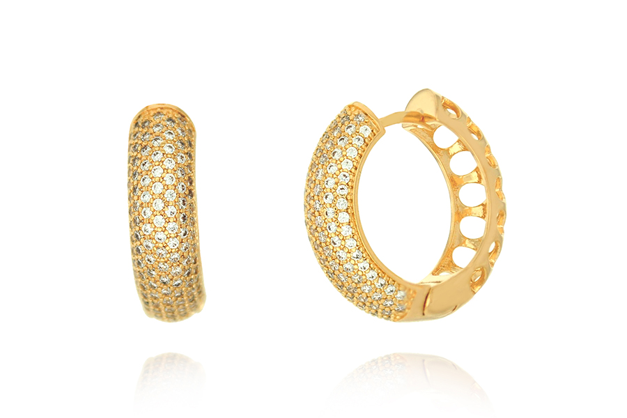 BRINCO BANHADO EM OURO, ARGOLINHA 13mm DIÂMETRO, 3 FILEIRAS E 15 ZIRCÔNIAS