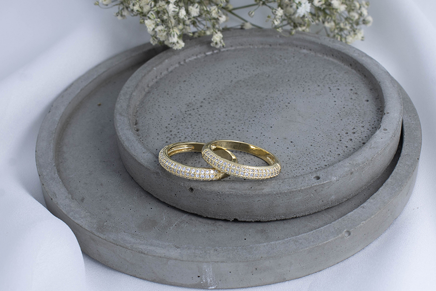 ANEL BANHADO EM OURO, ALIANÇA COM 29 ZIRCÔNIAS, TODO CRAVEJADO