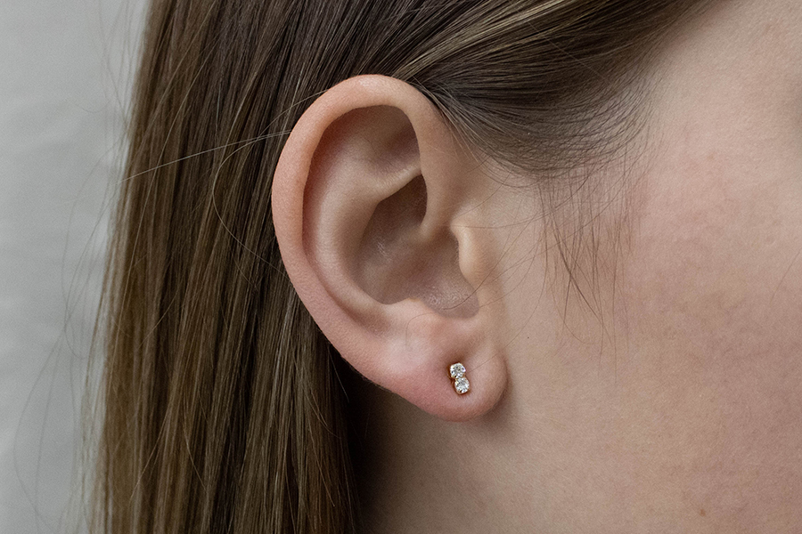 BRINCO BANHADO EM OURO, MEIA ESFERA 13mm DIÂMETRO COM ZIRCÔNIA E MEIA ESFERA LISA
