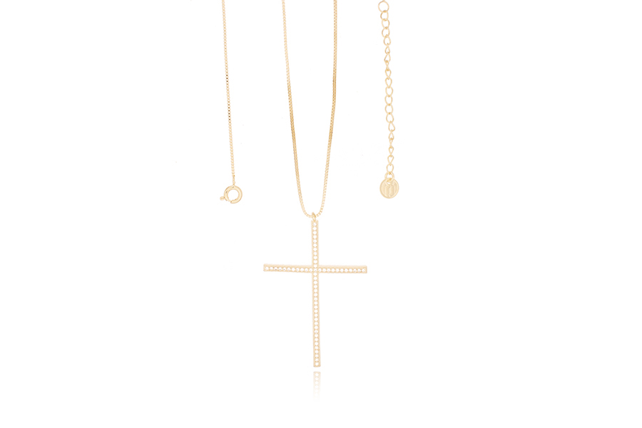 GARGANTILHA BANHADA EM OURO, VENEZIANA 0,80mm, 40cm COMPRIMENTO, EXTENSOR 5cm COMPRIMENTO E CRUZ 3,60X2,20cm