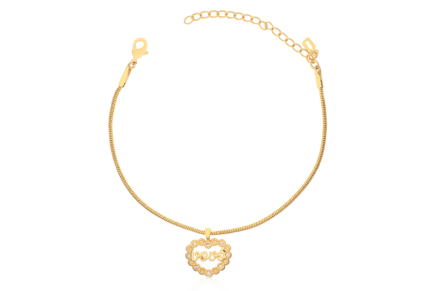 PULSEIRA INFANTIL BANHADA EM OURO, ELO 1,10mm COM BOLINHA, 14cm COMPRIMENTO, PONTO DE LUZ 3,50mm, AMOR DA DINDA 10mm COM CORAÇÃO